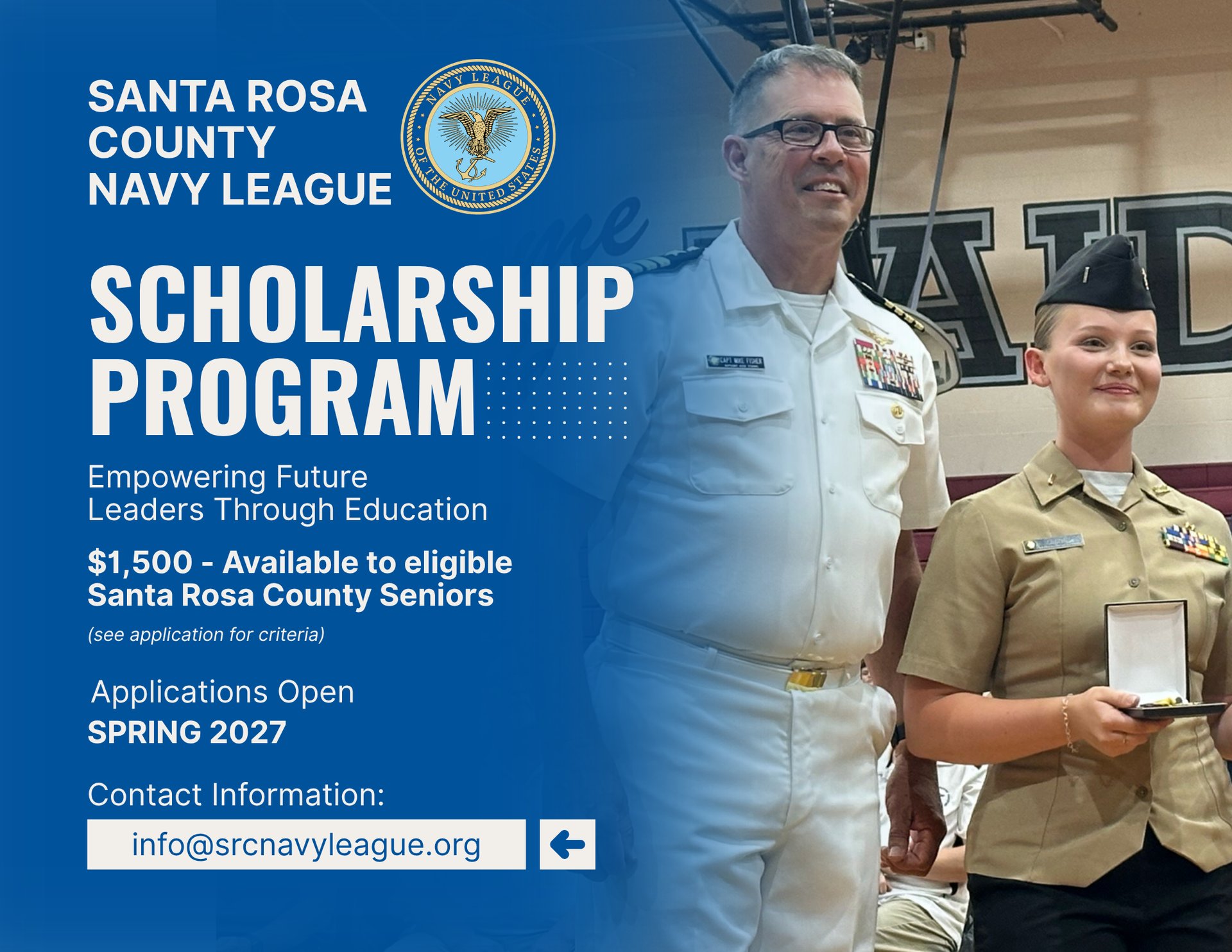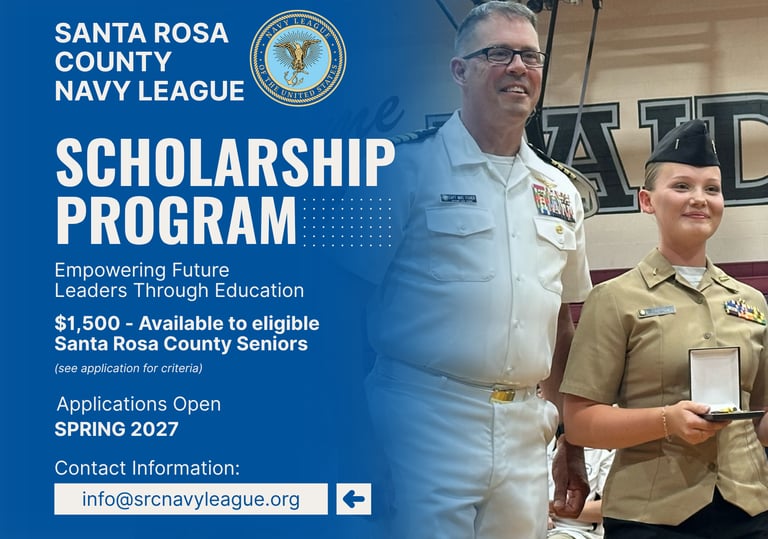 Each year, the Santa Rosa County Navy League awards scholarships to deserving students, helping offset the cost of college, technical training, or other post-secondary education opportunities. Special consideration is given to applicants involved in NJROTC, Sea Cadet programs, or those with a family connection to the military.